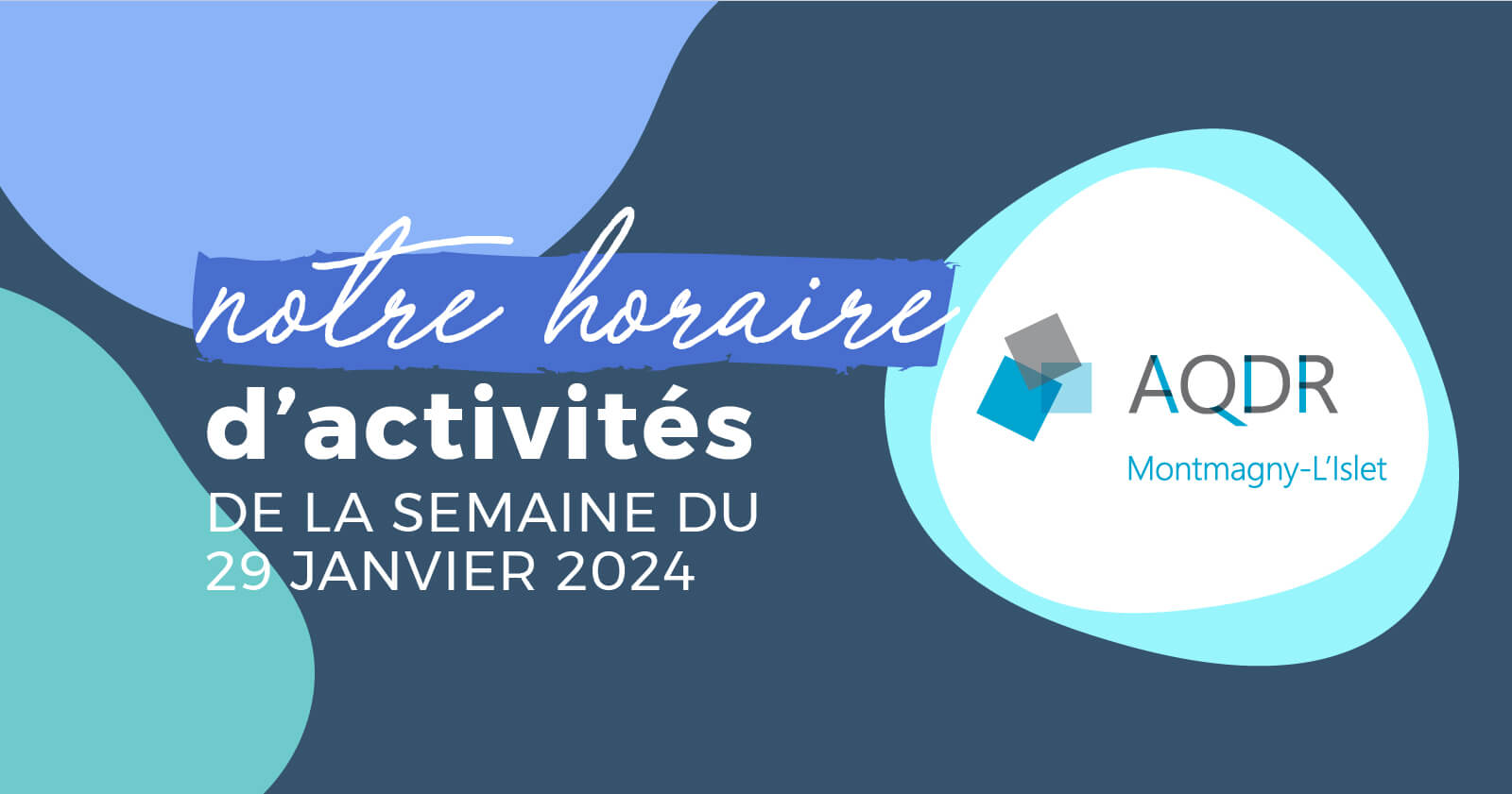Voici les activités de l’AQDR proposées au cours de la semaine du 29 janvier au 4 février 2024. Durant la prochaine semaine, informez-vous sur des astuces financières en lien avec l’inflation lors d’une conférence captivante. Apprenez-en plus sur la proche-aidance ou l’intimidation au cours d’une de nos conférences virtuel ou en restaurant. Puis, découvrez la technologie lors d’une de nos 3 ateliers branchés! Merci de bien vouloir prendre connaissance de notre programmation via le contenu ci-bas.