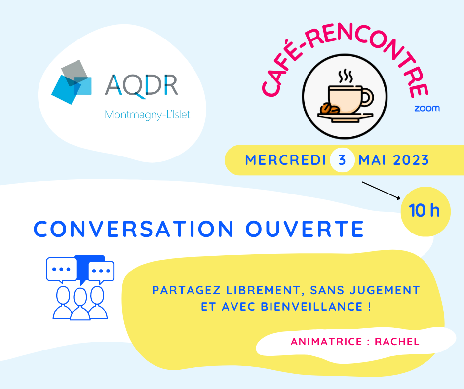 Rejoignez-nous lors de notre café-rencontre hebdomadaire pour une conversation ouverte, bienveillante et sans jugement. Partagez vos souvenirs, vos expériences dans un environnement sécurisé et convivial. Votre participation serait des plus enrichissantes.