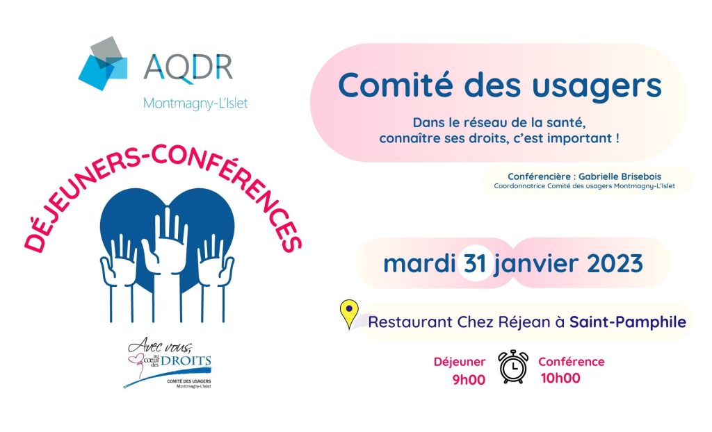 Venez assister à la prochaine conférence en collaboration avec le Comité des usagers de Montmagny-L’Islet. Le Comité des usagers a pour mandat de faire connaitre les droits des usagers et de les défendre. Pour en apprendre davantage sur vos droits en matière de santé, nous vous donnons rendez-vous :