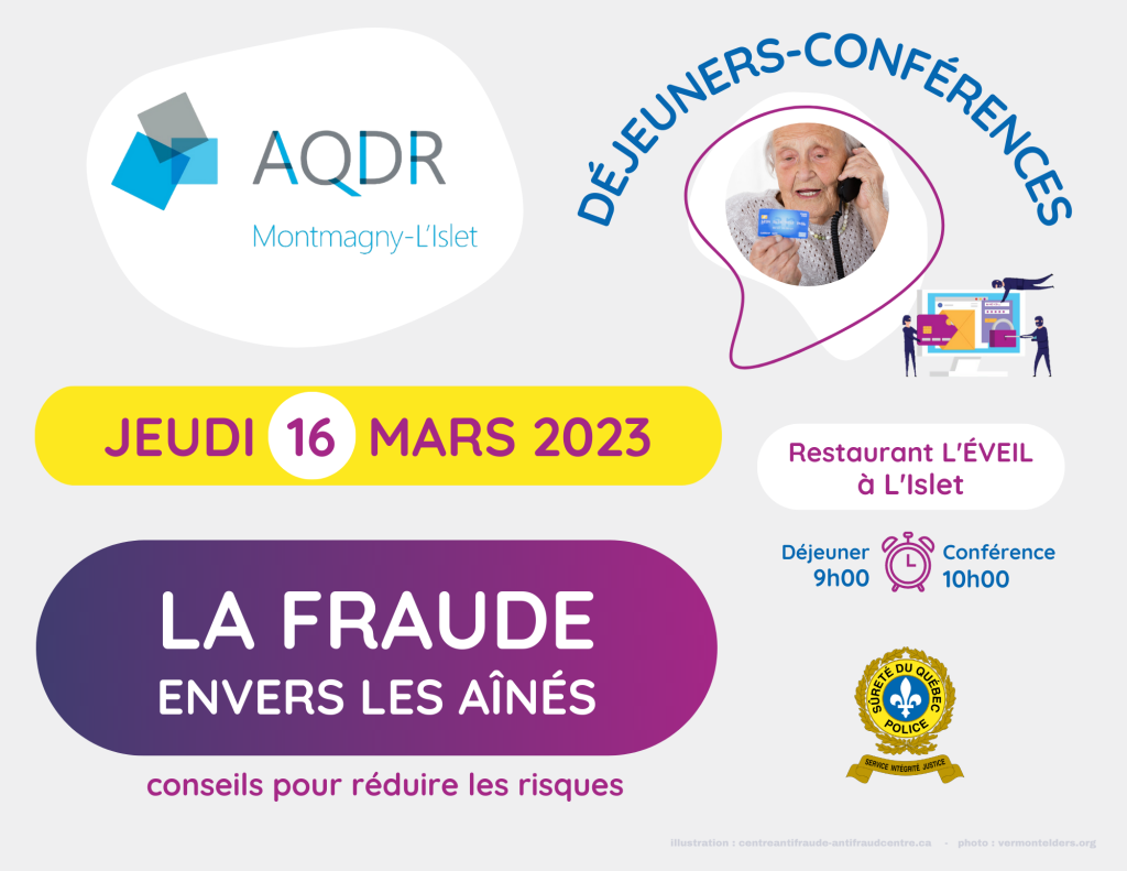Nous avons le plaisir d’annoncer que la Sûreté du Québec organisera une conférence portant sur la fraude envers les aînés. Cette présentation informative a pour objectif de sensibiliser nos membres aux diverses formes de fraude, tout en leur fournissant des outils pour prévenir de telles situations. La conférencière abordera également les mesures à prendre en cas de fraude. Bien que l’accès à la conférence soit gratuit, une inscription préalable est nécessaire.