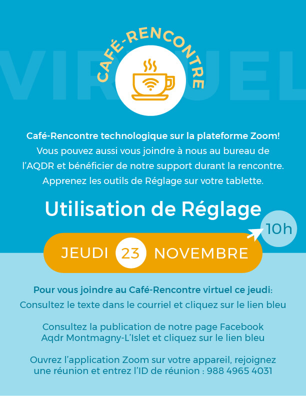 Pour tout le mois de novembre, nos Cafés-Rencontres virtuels qui ont lieu chaque jeudi de 10h à 11h seront dédiés à de petites formations sur l’utilisation des technologies. Voici ci-bas un lien cliquable en BLEU pour ouvrir l’application Zoom et vous joindre à la rencontre du 23 novembre.