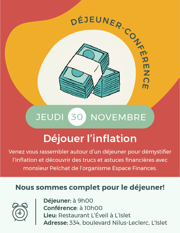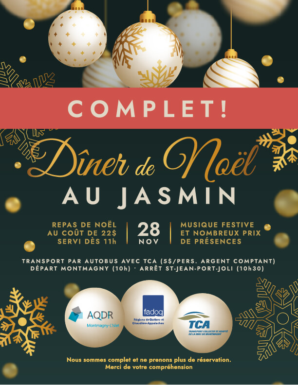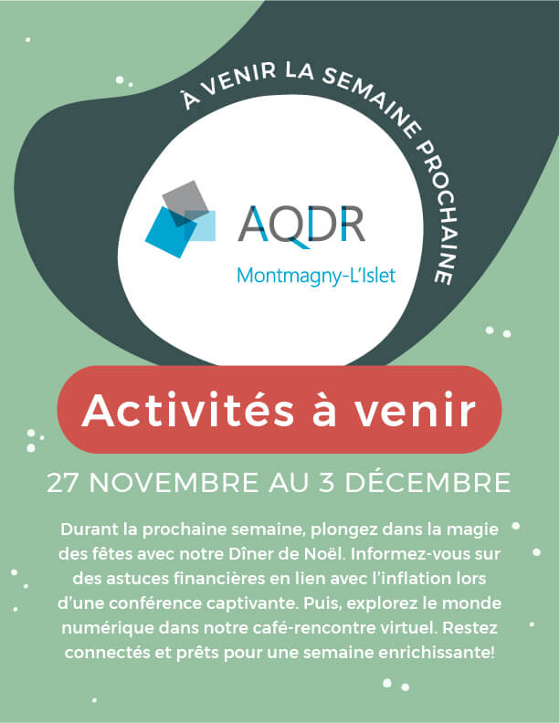 Voici les activités de l’AQDR proposées au cours de la semaine du 27 novembre au 3 décembre 2023. Durant la prochaine semaine, plongez dans la magie des fêtes avec notre Dîner de Noël. Informez-vous sur des astuces financières en lien avec l’inflation lors d’une conférence captivante. Puis, explorez le monde numérique dans notre café-rencontre virtuel. Restez connectés et prêts pour une semaine enrichissante! Merci de bien vouloir prendre connaissance de notre programmation via le contenu ci-bas.