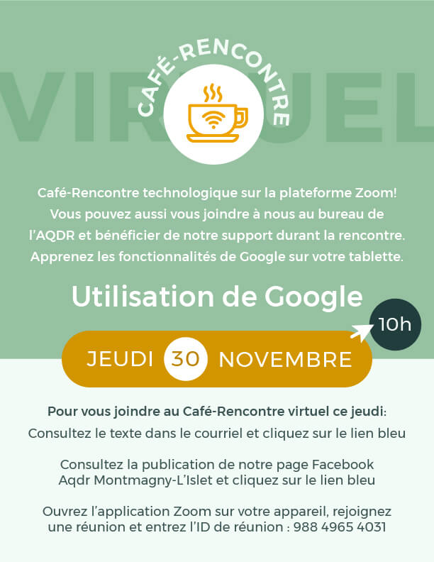 Pour tout le mois de novembre, nos Cafés-Rencontres virtuels chaque jeudi de 10h à 11h sont dédiés à de petites formations sur l’utilisation des technologies. Voici ci-bas un lien cliquable en BLEU pour ouvrir l’application Zoom et vous joindre à la rencontre du 30 novembre.