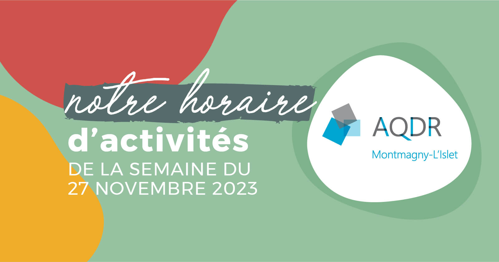 Voici les activités de l’AQDR proposées au cours de la semaine du 27 novembre au 3 décembre 2023. Durant la prochaine semaine, plongez dans la magie des fêtes avec notre Dîner de Noël. Informez-vous sur des astuces financières en lien avec l’inflation lors d’une conférence captivante. Puis, explorez le monde numérique dans notre café-rencontre virtuel. Restez connectés et prêts pour une semaine enrichissante! Merci de bien vouloir prendre connaissance de notre programmation via le contenu ci-bas.