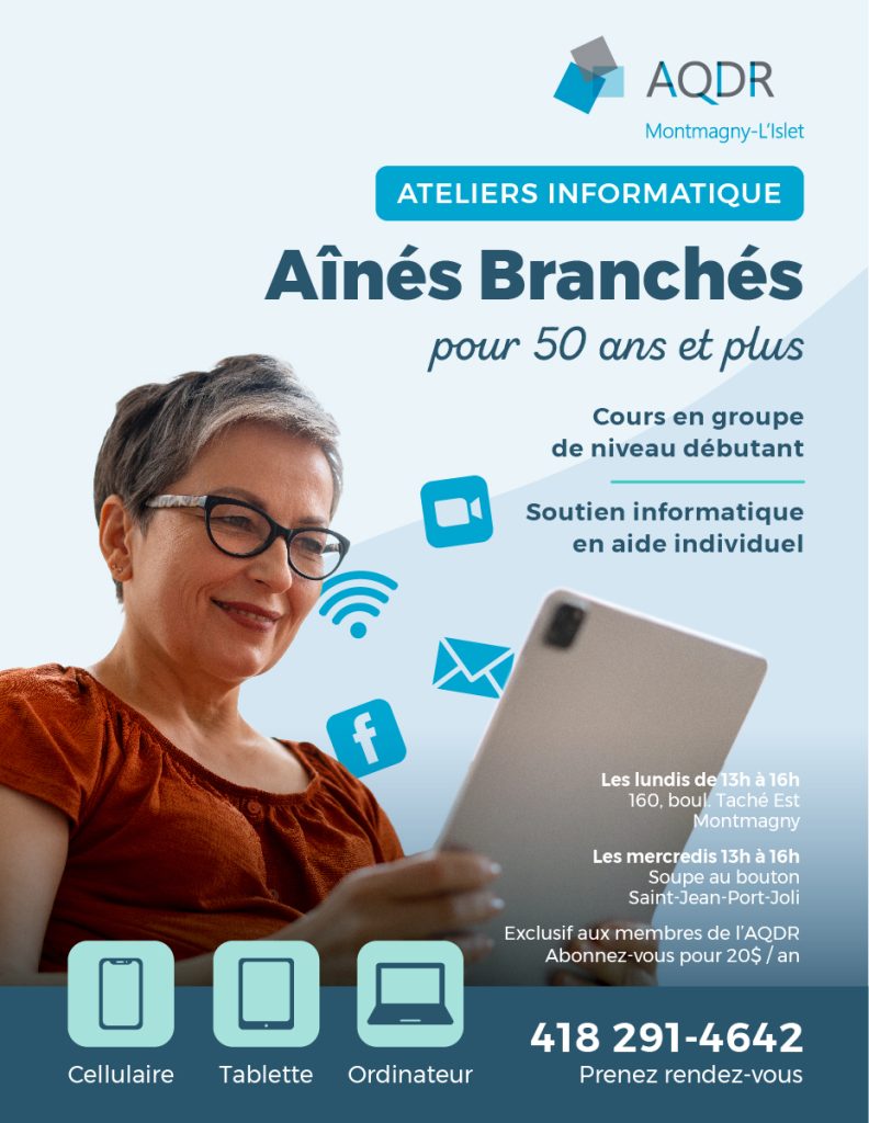 Aînés Branchés c’est des cours informatiques individuels, des prêts de tablettes, des ateliers thématiques en groupe et des périodes de soutien express 2 fois par semaine les lundis après-midi à Montmagny au 160, boul. Taché Est et les mercredis après-midi à Saint-Jean-Port-Joli au local de la Soupe au bouton.