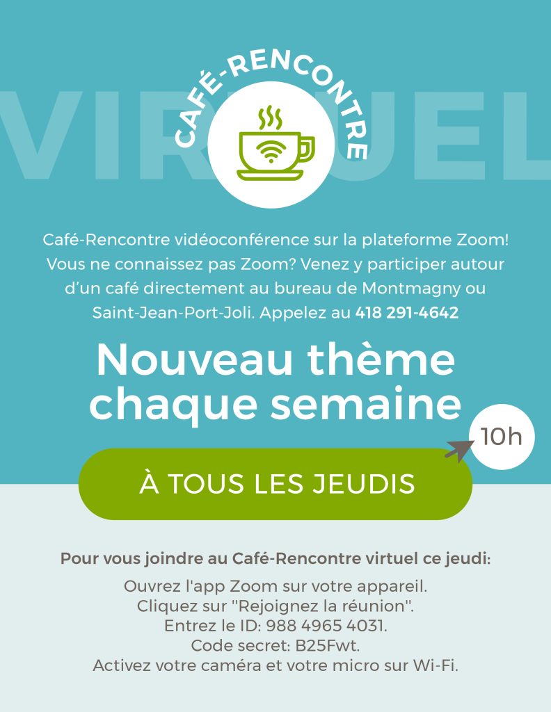 De plus, nous avons dans notre programme estival les Cafés-Rencontres animés par notre intervenante Rachel, chaque jeudi matin à 10h00 sur la plateforme Zoom. Ces rencontres permettent des discussions enrichissantes sur divers sujets qui touchent les 50 ans et plus dans une ambiance bienveillante et sans jugement.