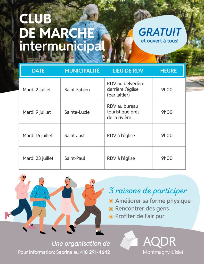 - Club de marche intermunicipal dans Montmagny-Sud (organisé par l’AQDR): chaque mardi à 9h00. Calendrier en pièce jointe.